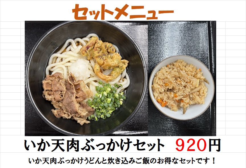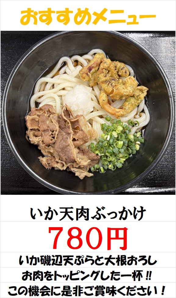 UDON陽では、10月のおすすめメニューとして「いか天肉ぶっかけ」を販売いたします。
